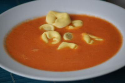 Ich esse die Suppe immer mit einer kleinen Beilage, auf dem Bild sind es Tortollini.